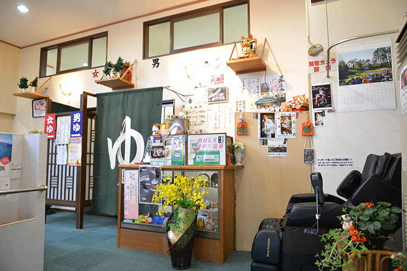 入口の左側に下駄箱、番台は小綺麗に飾り付けられています。