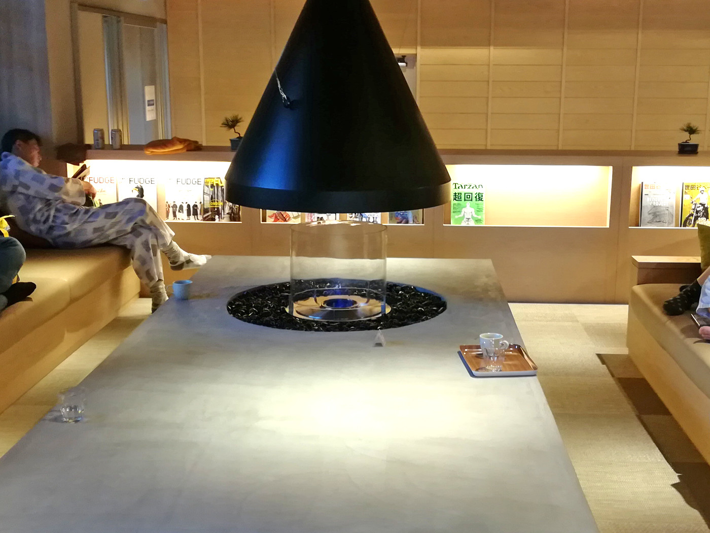たくさんの書籍や、ボードゲームも用意されているので、ここで遊ぶだけでも来る価値があるとも言えます。中央に囲炉裏が常設されたテーブルを囲めば、すっかり宿場町気分ですね。